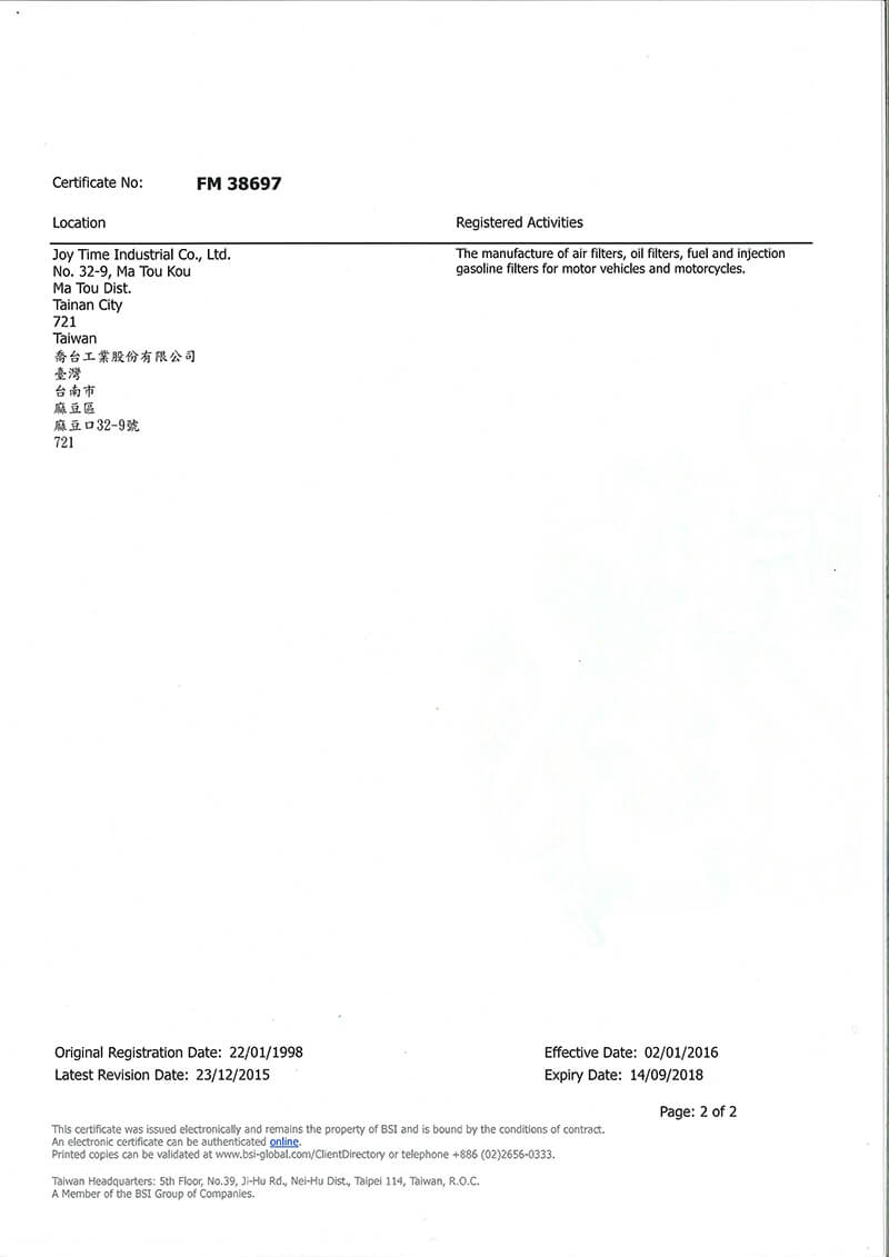 About Us Company Profile History Certificates Manufacturing Equipment Quality Verification Equipment Certificates Joy Time Engine Filters > Certificates Joy Time Industrial Co., LTD. ISO 9001 quality certification-from 2001